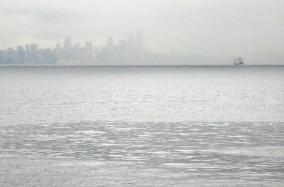 nearing the far shore engulfed by fog the ferry vanishes from sight
