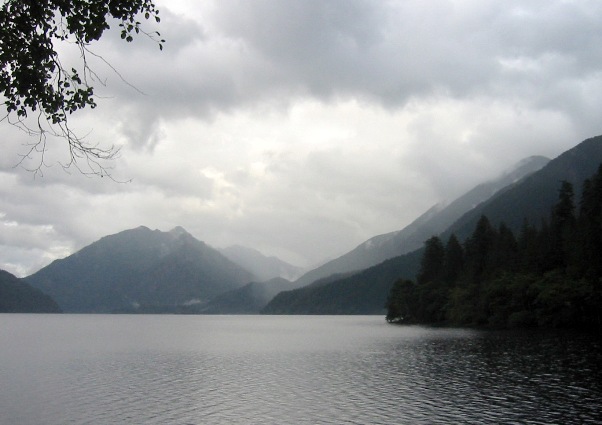 over mountain lake heavy clouds hover and mists rise from the forest |
